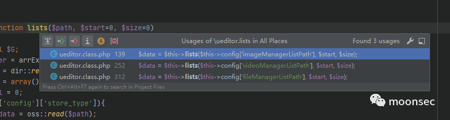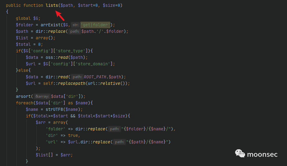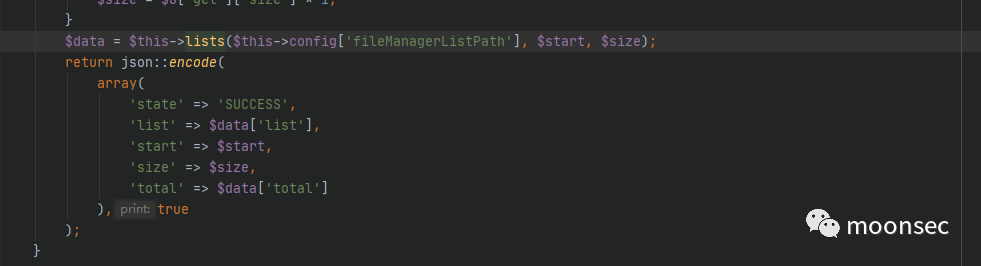 我们接着翻找 ueditor.class.php 文件下的方法时,找到一处 lists() 方法,在代码327行处