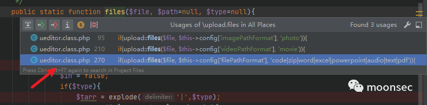所以想要实现php文件的上传,我们需要传入的type类型为code才行我们全局查看files()方法调用,发现该处功能点传入的类型中有code,我们跟进该方法进行查看。