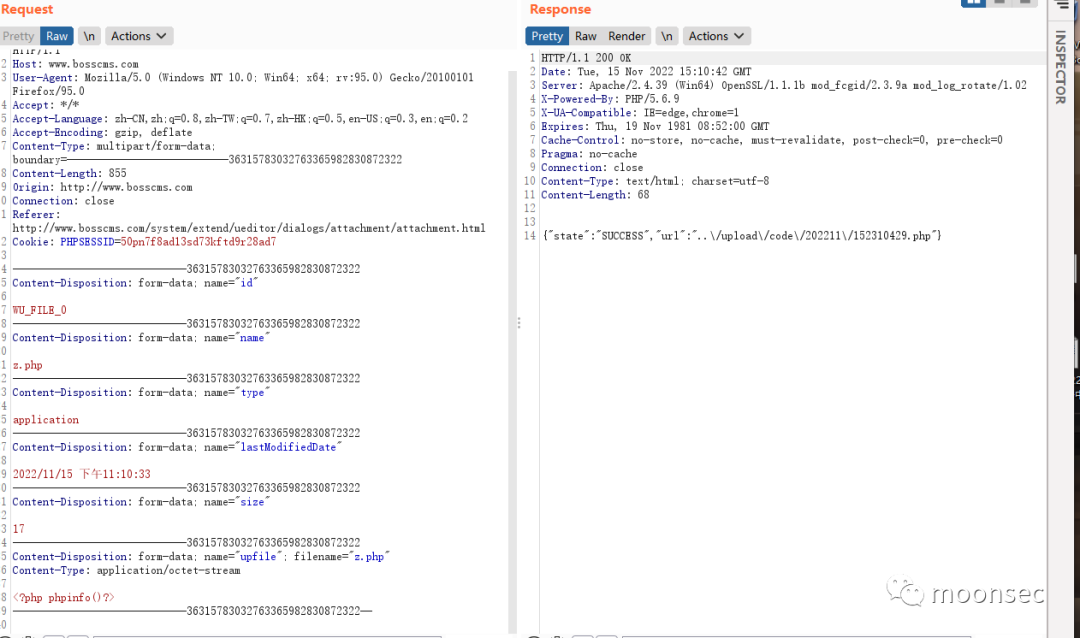 在后台中发现允许上传类型中出现了.php文件类型最后通过编辑器的文件上传功能进行文件上传,从下图可以看到文件上传已经成功然后进行302跳转。