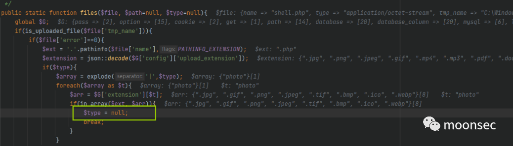 $t是遍历$arrary获得的,而$array是分割$type获得的,可以看到files函数调用时$type默认值是null,那么就是调用时指定code值