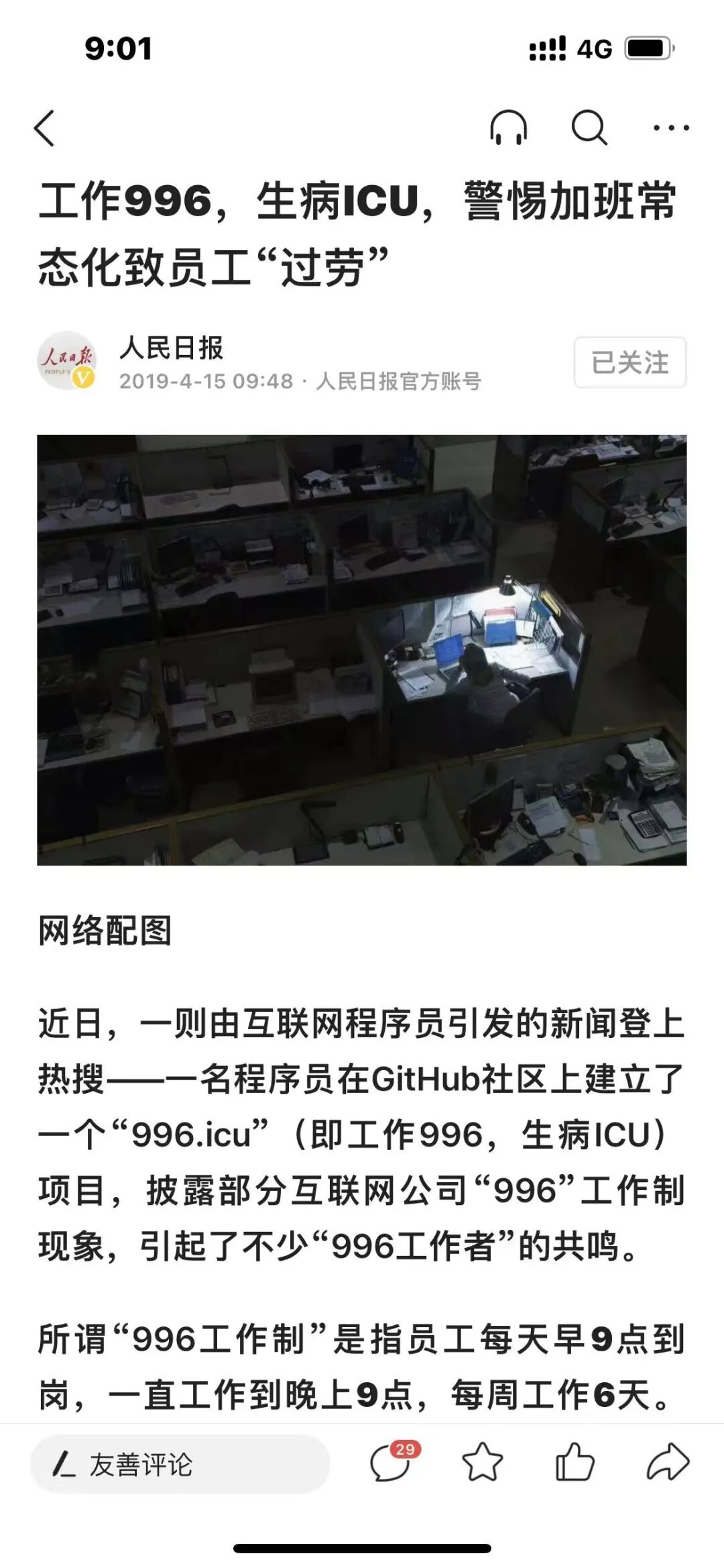 2019年4月11日,人民日报针对“996工作制”发表评论员文章《强制加班不应成为企业文化》 [4] ;