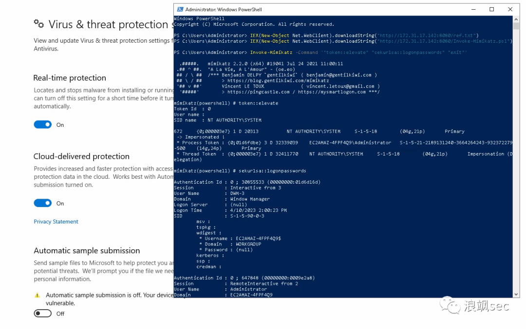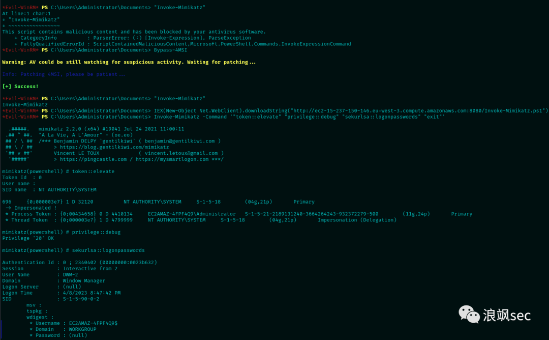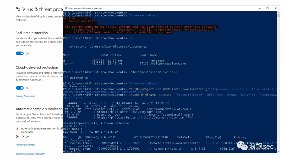 请注意,Mimikatz的执行只是为了演示,但是您可以在没有AMSI遥测的PowerShell终端上执行几乎所有操作。