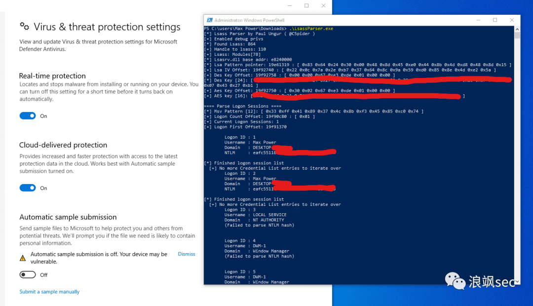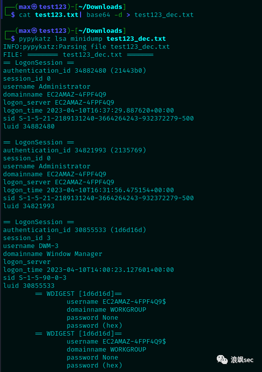 注意,最后我使用了一个稍微修改过的脚本,在将转储文件写入文件之前将其加密为base64,因为Defender将该文件检测为LSASS转储文件并将其删除。
