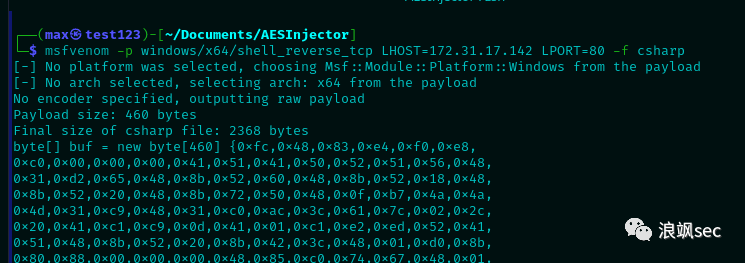 首先,我们需要生成初始的shellcode。对于这个概念证明,我将使用msfvenom的一个简单的TCP反向shell。