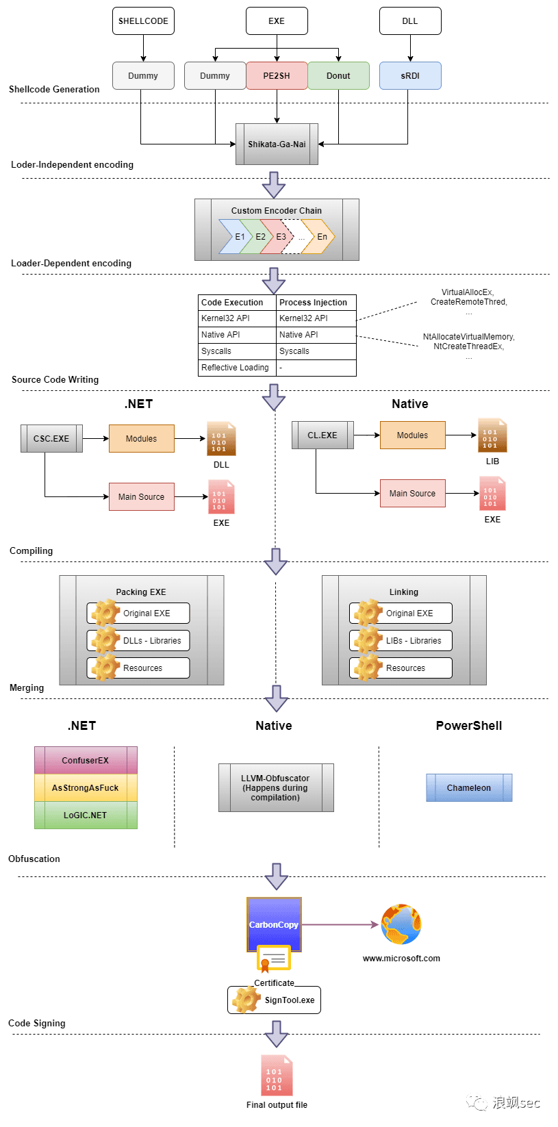 现在已经解释了从可执行文件开始规避 AV 的所有可能方法,我想提一下将所有步骤合并到一个工具中的框架:KlezVirus 的 inceptor。该工具可能会变得非常复杂,并且大多数步骤对于简单的 Defender 规避都不需要,但下图可能会更好地解释它: