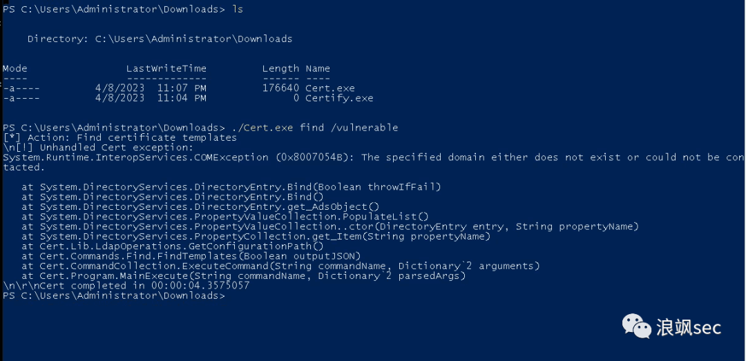 例如,使用GhostPack的认证工具(通常用于在域中查找易受攻击的证书),我们可以利用上述工具绕过防御器,如下所示。