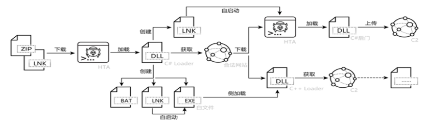 近日,安恒信息的研究人员披露了具有巴基斯坦背景的APT组织,SideCopy使用新后门FetaRAT针对印度国防和军事部门的攻击活动。通过分析本次攻击活动的样本,研究人员表示,此次攻击活动的样本托管在一家印度翻译公司网站上,样本主要针对印度国防、军事实体,而且攻击活动的初始阶段攻击手法仍旧以模仿Sidewinder组织为主。后续下发新的C#后门木马,研究人员将其命名为FetaRAT。该后门主要功能包括网络连接、信息获取、文件上传、截屏上传以及播放音频等。在此次攻击活动中,Sidecopy组织通过入侵合法网站elfinindia托管恶意文件,增加了攻击者的匿名性和隐蔽性,使其更难被追踪和发现。攻击链图如下图所示。