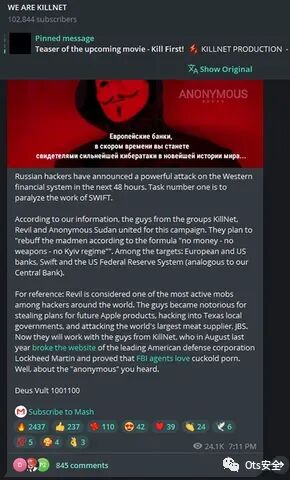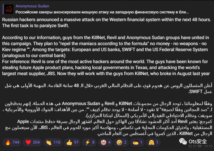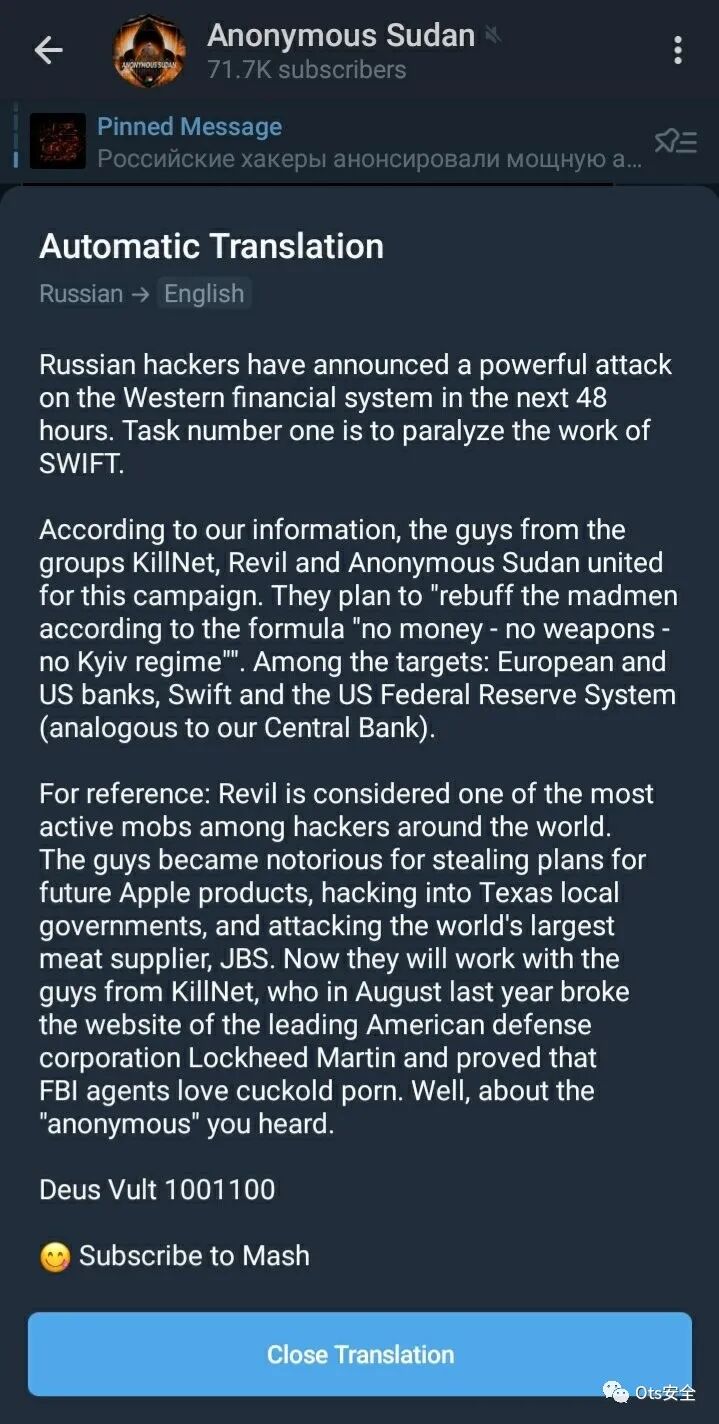 2023 年 6 月 14 日,名为 Killnet 的俄黑客组织在其 Telegram 频道中警告称,未来 48 小时内将对西方金融系统发起强大的攻击。所谓的目标包括 SWIFT 电汇系统、欧洲、美国的银行和美国联邦储备委员会。除了 SWIFT 和美国联邦储备委员会之外,没有其他具体实体在帖子中直接被点名。该帖子声称来自 Killnet、REvil 和 Anonymous Sudan 的威胁参与者将联合起来参加这场运动。Killnet 指出攻击的动机是美国提供武器援助乌克兰,声明:
