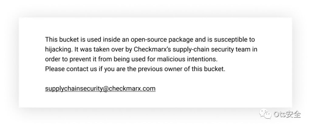 为了防止这种攻击发生在其他地方,我们接管了我们在搜索中发现的开源包中的所有废弃存储桶。现在,当有人试图访问这些存储桶中托管的文件时,他们将收到我们植入这些存储桶中的免责声明文件。