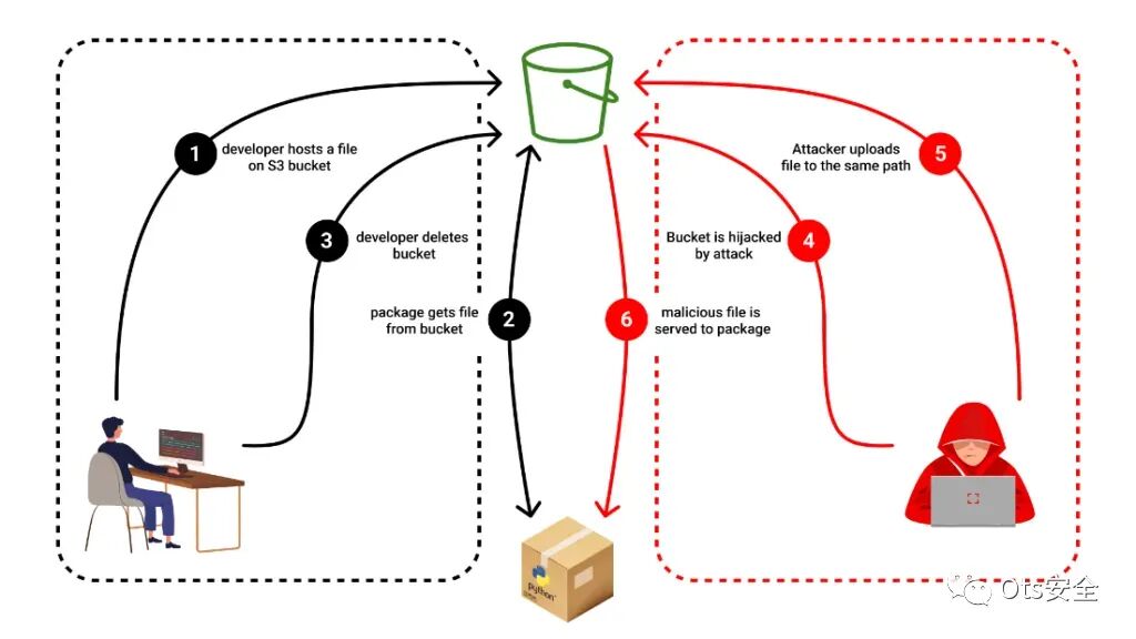 请务必注意,每个 AWS S3 存储桶必须具有全球唯一的名称。删除存储桶后,该名称将再次可用。如果一个包指向一个桶作为它的源,那么即使在桶被删除之后,指针也会继续存在。这种异常使攻击者可以将指针重新路由到接管的存储桶。