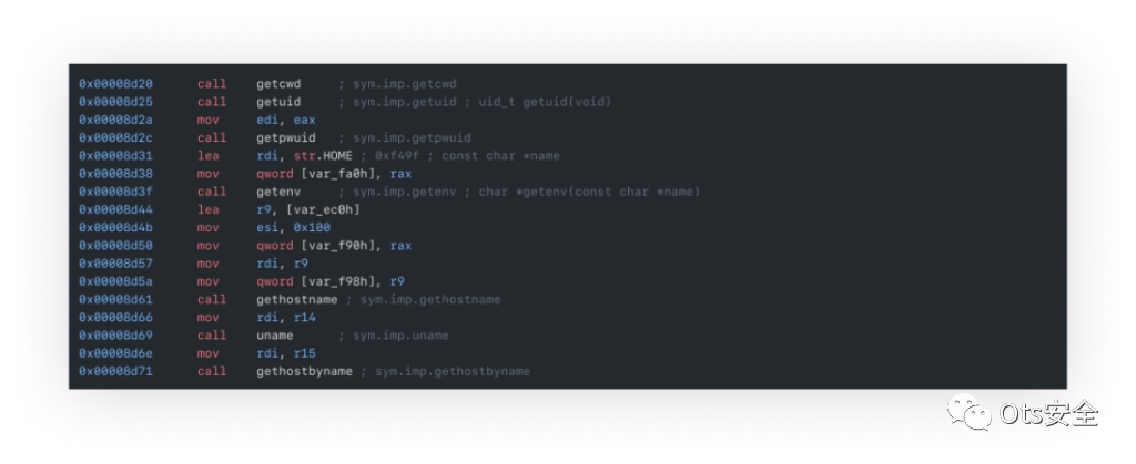 进一步调查显示,二进制文件通过 getpwd 和 getuid(如字符串打印输出所示)等函数收集数据,提取环境数据。然后,它为 IPv4 通信创建了一个 TCP 套接字,并作为“GET”请求的用户代理秘密发送收集到的数据。