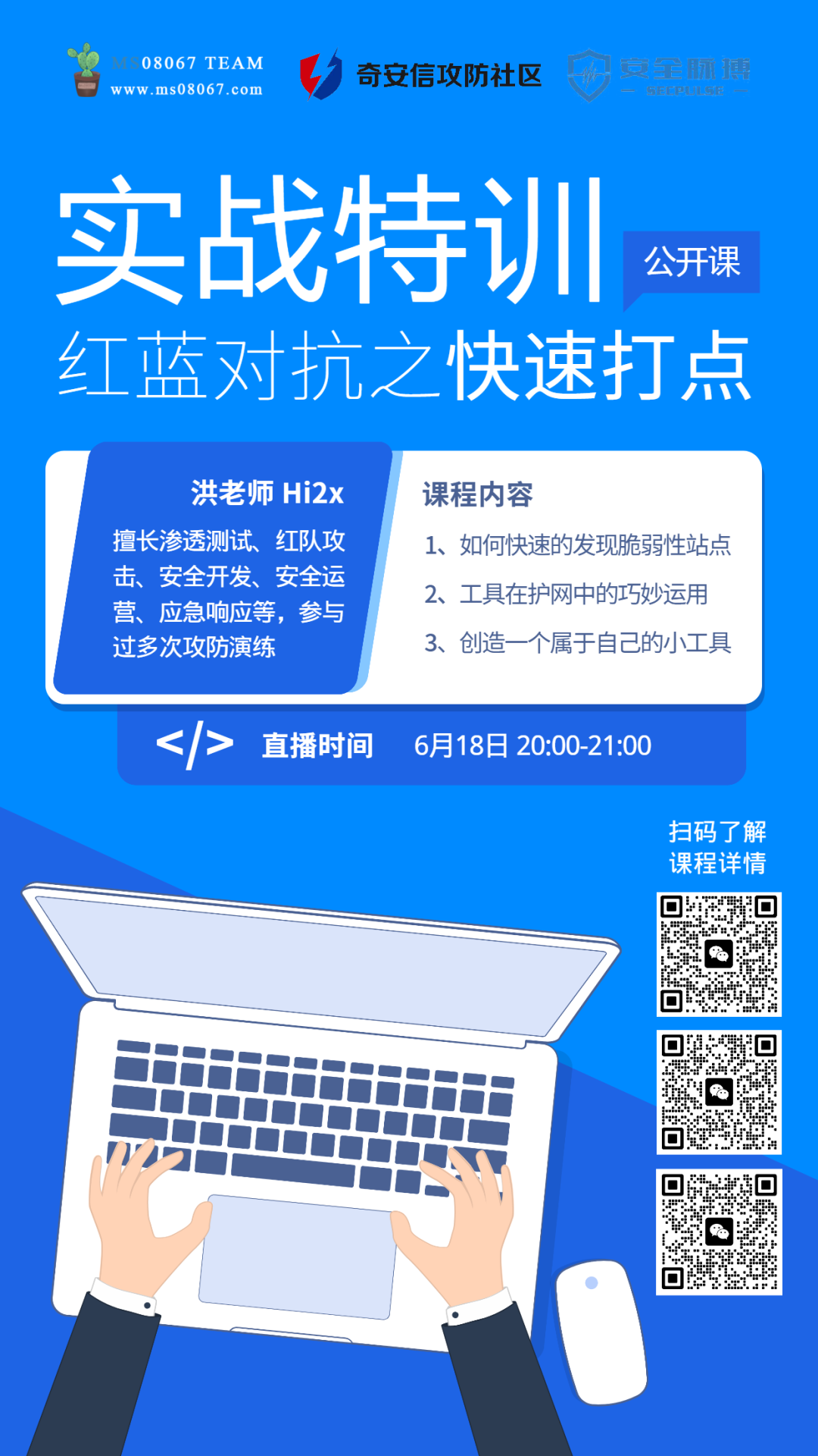 《红蓝对抗实战特训营》6月10日-7月14日期间本次特训营将联合奇安信攻防社区和安全脉搏,共同承办,我们精心挑选了MS08067实验室6位深受好评的王牌导师,将以红蓝对抗中的一套丝滑的“连招”,让大家