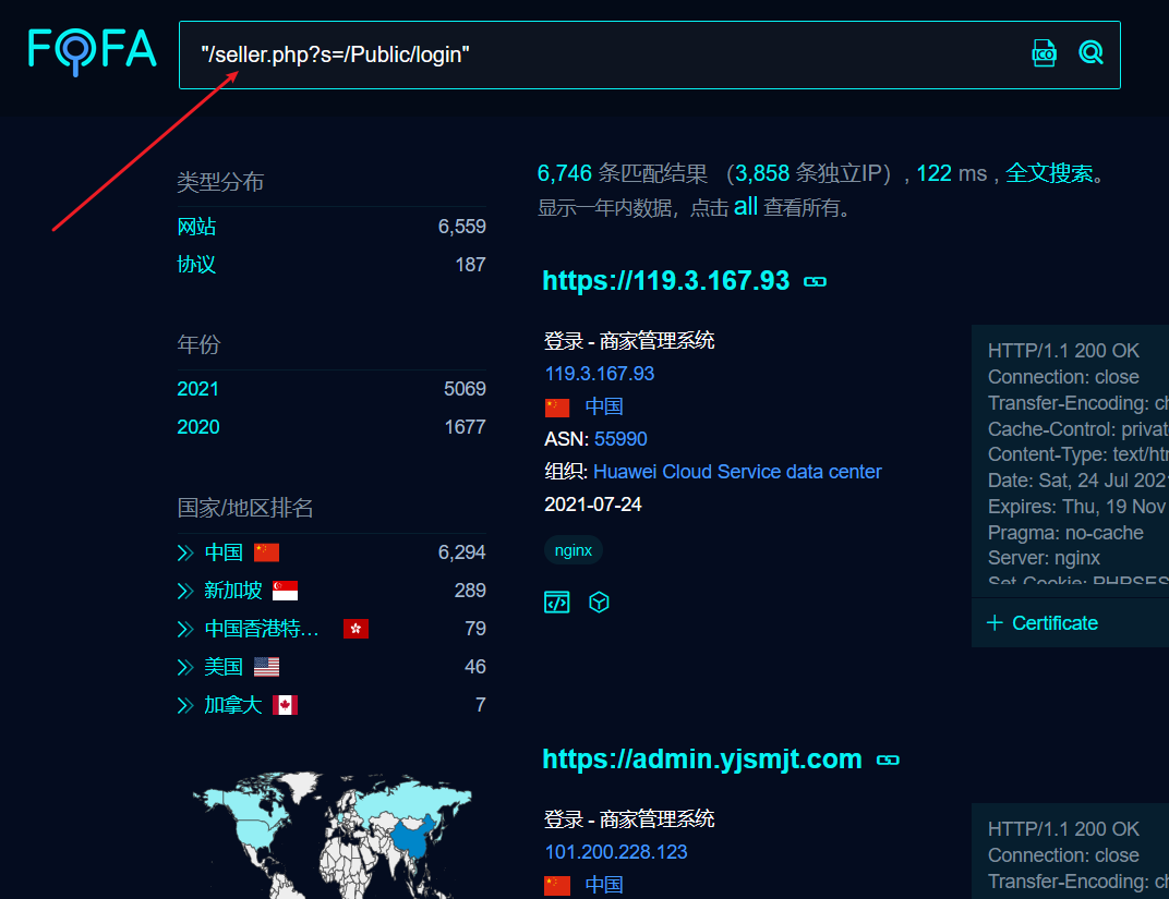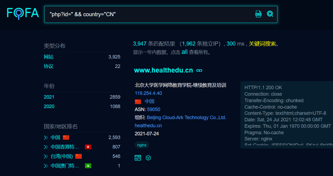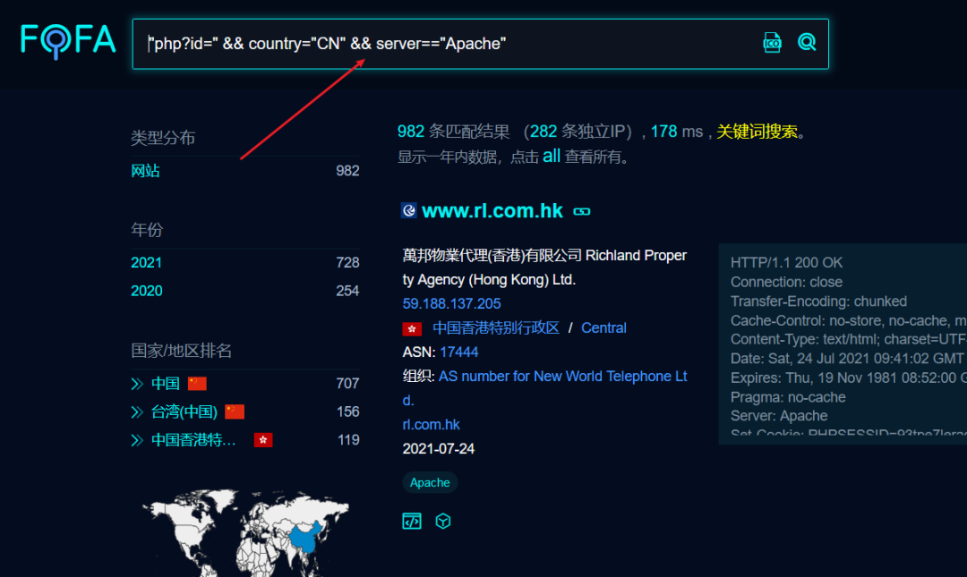 还可以继续加条件,比如 server==”Apache”,那fofa就只会搜索中间件为Apache的网站,搜索功能比较强大。