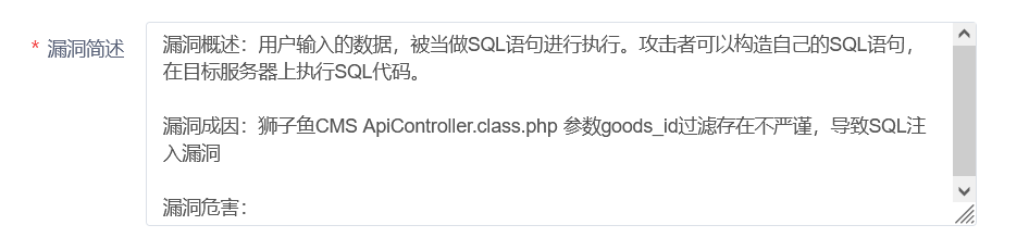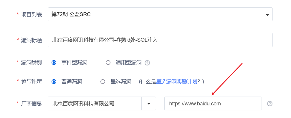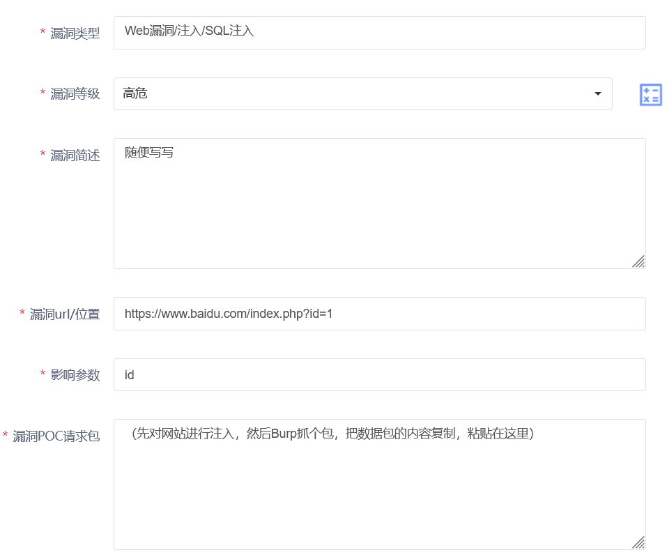 漏洞类型:一般都是Web漏洞,然后漏洞是什么写什么,这里是一个SQL注入。