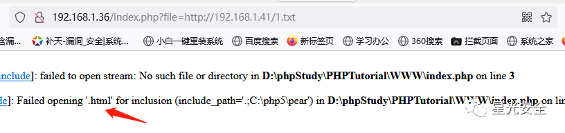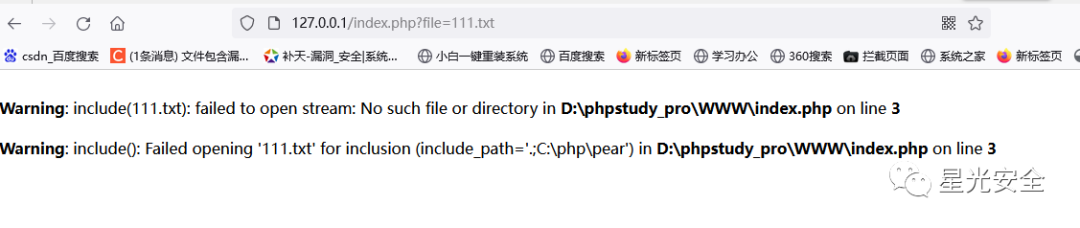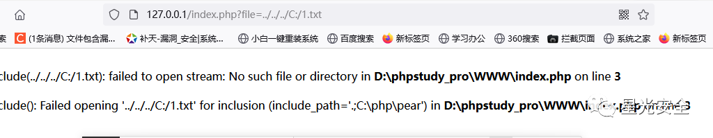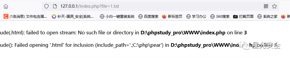 这段代码的意思是GET传参,赋值给变量file,然后包含这个变量file,而GET传进来的参数必须是我们的WWW目录下有的参数,如果没有则会报错,如下图所示