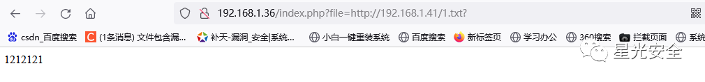 同样我们进行绕过,这种绕过方式和我们的本地包含漏洞有所不同,可以直接在url中1.txt后面直接加?、%23或者%20,长度截断在此处不适用,%00也可以。