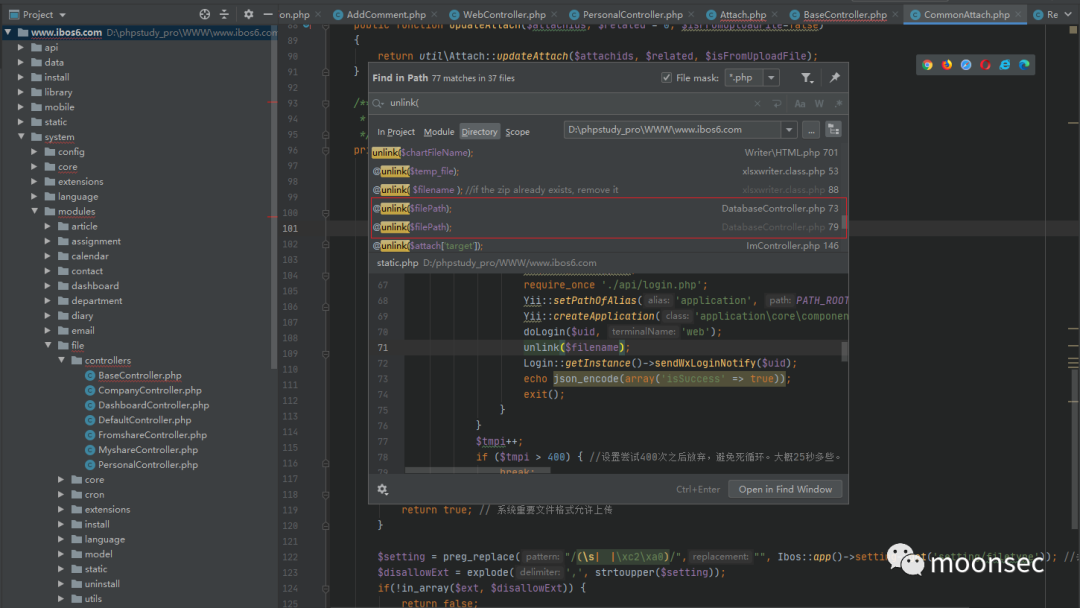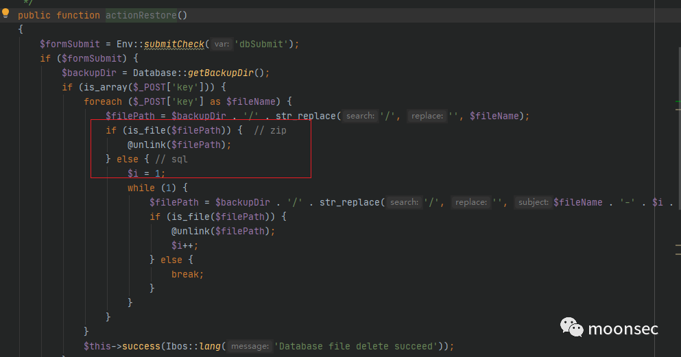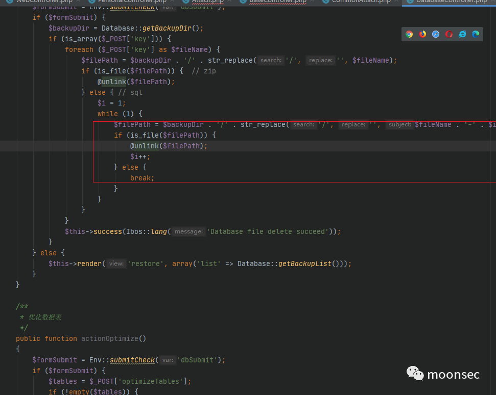 在system目录中搜索unlink函数,在 DatabaseController.php 中发现一处很明显的参数可控造成的任
