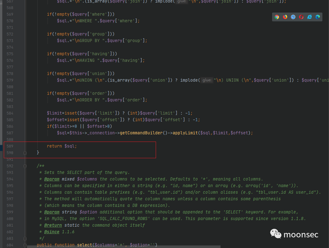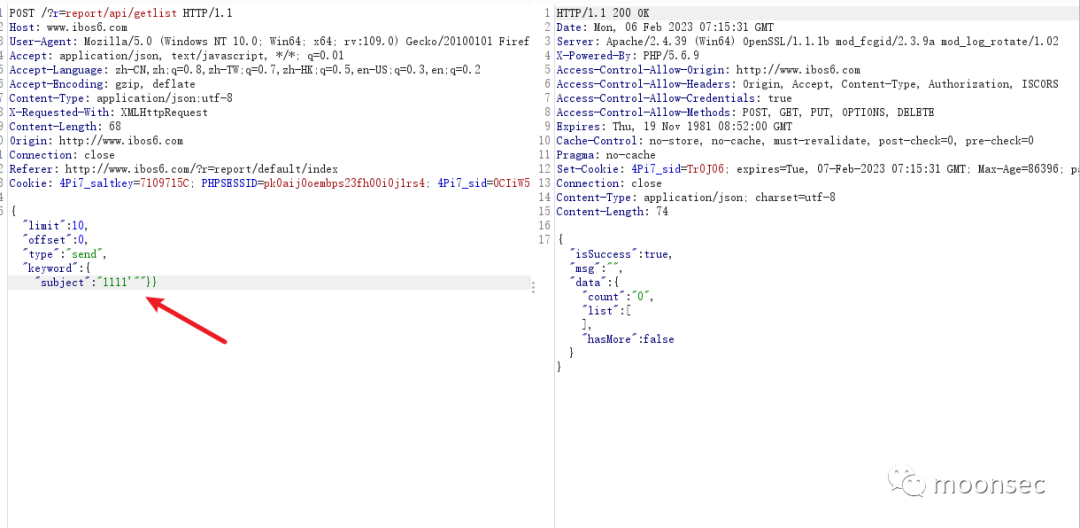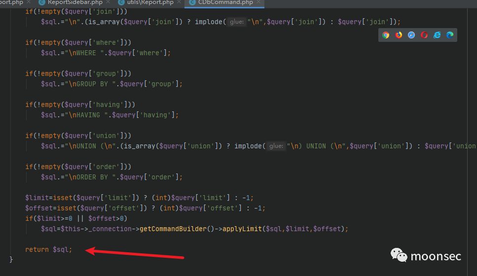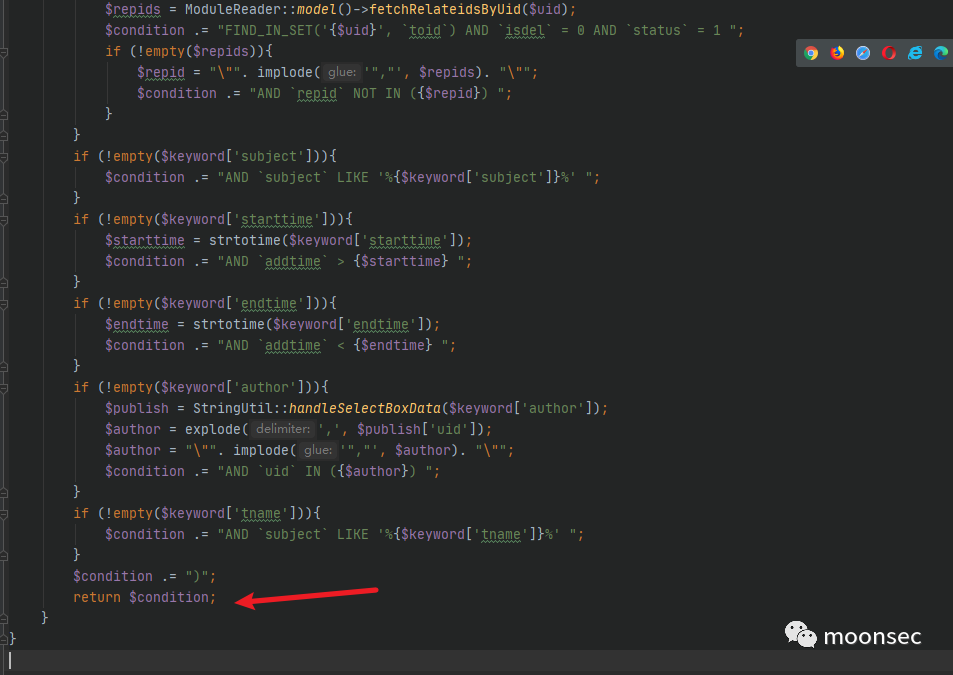 结合数据包以及代码进行分析,我们可以发现存在报错的数组下的 keyword 下的 subject 参数,在代码30行判断keyword参数是否为空,在32行将参数值带到 getListCondition() 方法中,这个方法是用来进行SQL语句拼接的,最后带到代码33行处的 getReportByCondition() 方法进行一些列的SQL语句执行的操作。