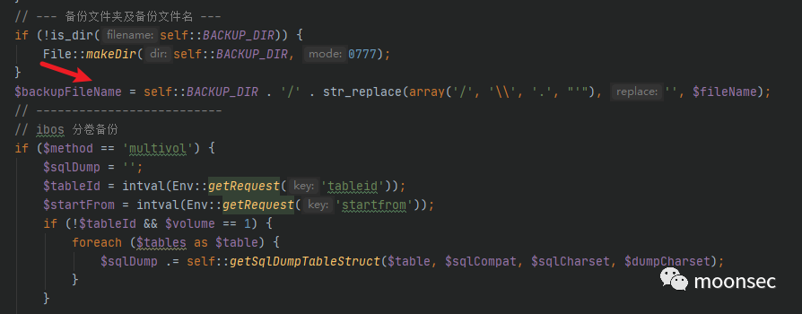 而在else分支中 $backupFileName 经过拼接传递到了 $dumpFile 参数中。