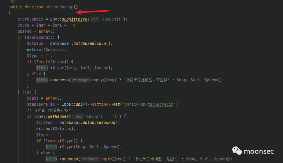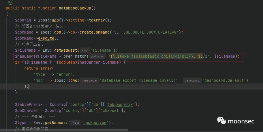 该处调用了 actionBackup() 方法,然后进行判断。在33行代码处调用了database类下的 databaseBackup() 方法,从这个方法名来看该方法可能是用来进行数据库备份的,跟进该方法。通过 Env::getRequest 方法,filename参数来传入我们上传的文件名,也就是我们上面所提到的可以控制的部分,然后对文件名进行过滤,这里对一些后缀进行了过滤。