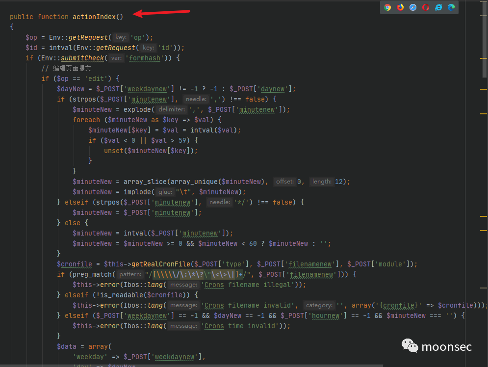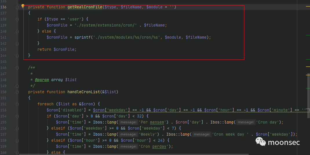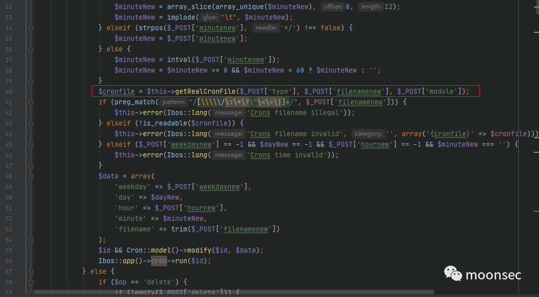 看第40行getRealCronFile()函数会形成一个完整的文件路径,第41行到第47行,这是用来过滤修改计划任务的文件名的字符串。