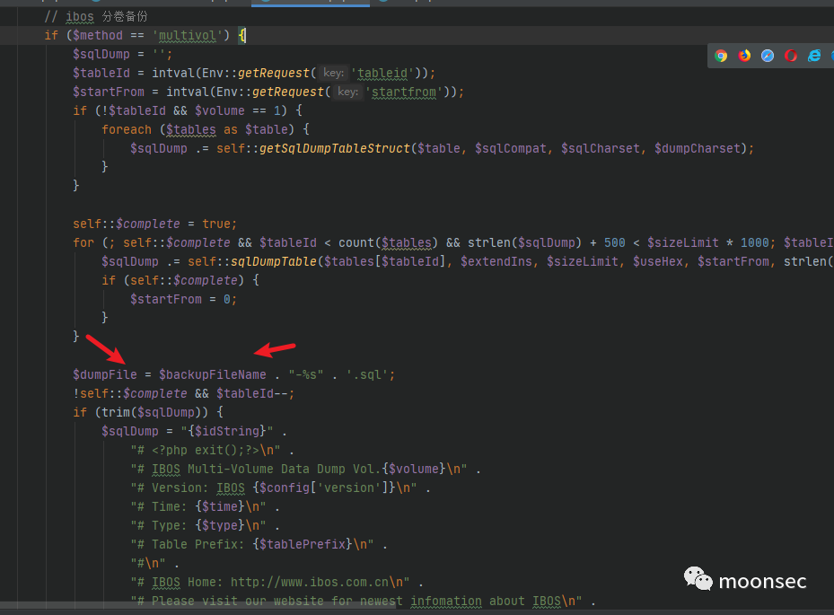首先在 $method == 'multivol' 这个if分支中将 $backupFileName 参数进行拼接并赋值给$dumpfile ,经过分析发现在该if分支中 $dumpfile 在传递的过程中并未有危险操作。