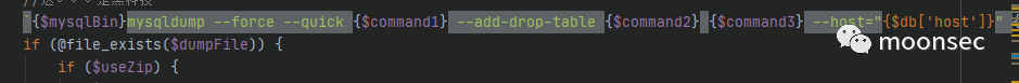 上述的 $dumpFile 参数最终被拼接到了453行的代码中,在PHP中反引号中的字符串可以被当做命令来执行,且这里的$dumpFile参数是可控的。
