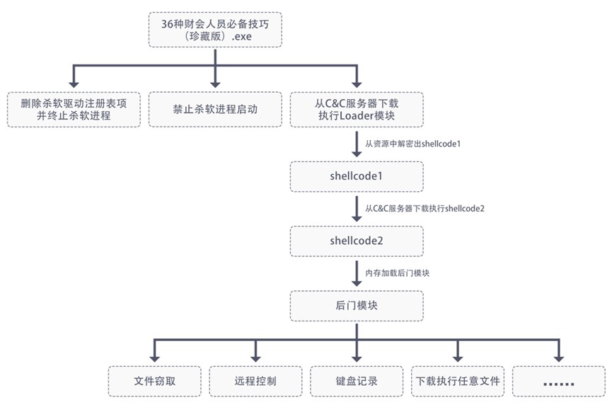 近期,研究人员监测到一个伪造成"36种财会人员必备技巧(珍藏版) .rar"的压缩包在微信群聊中快速传播。当用户下载解压该rar文件后,文件中存在一个exe文件,用户运行文件后,病毒就开始执行代码。首先病毒会利用Zemana在注册表中删除其他杀毒软件的驱动注册项,病毒携带的删除杀软名单包括avast、360等。此外,该病毒还会通过镜像劫持功能,禁止杀毒软件进程启动。禁用杀毒软件后,病毒会外联C2服务器传递系统信息,随后C2服务器响应匿名文件网站链接从而下载加载器程序CMO03.exe,最后执行shellcode访问C2服务器,获取后续代码加载后门模块,后门模块具备功能包括键盘记录、文件窃取、远程控制等。