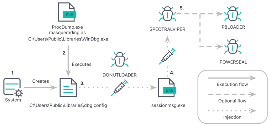 在研究人员的调查过程中,观察到一个以前未发现的后门恶意软件系列,并将其命名为 SPECTRALVIPER。SPECTRALVIPER 是一个 64 位 Windows 后门,用 C++ 编码并且经过了高度混淆。它以两种不同的通信模式运行,允许它通过 HTTP 或 Windows 命名管道接收消息。