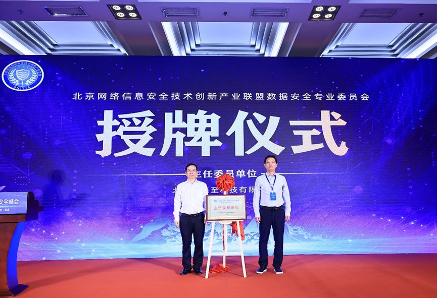 中共北京市海淀区委员会副书记杨仁全、北京云集至科技公司创始人廉小伟共同为联盟数据安全专委会成立揭牌