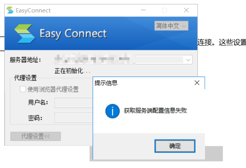 在使用EasyConnect登录时会提示获取服务端配置信息失败,确保网络正常,EasyConnect客户端正常后可以进行如下几步试试: