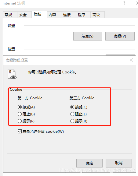 注意:有时输入vpn的服务器地址后会提示cookie禁用之类的提示,在Internet选项的隐私中将它改为提示或者允许就可以了。