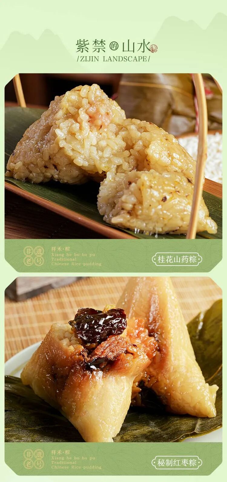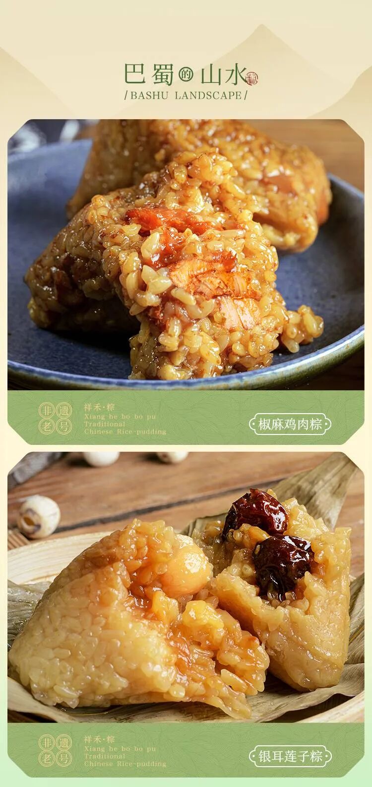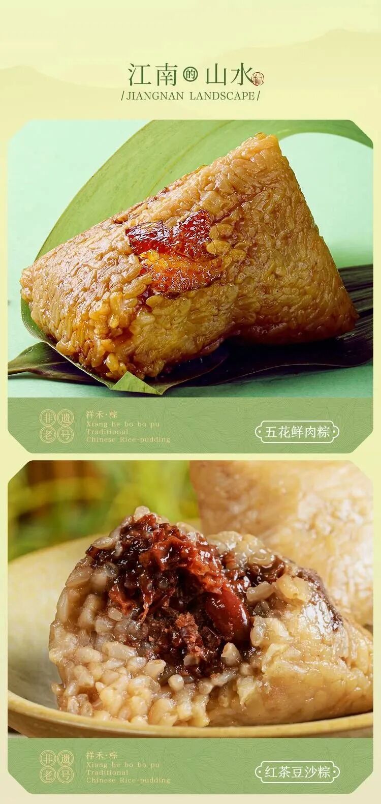 桂花山药粽:高山流水遇知音、桂树花落知食客,江米的软糯桂花的芳香、充分的融合在一起、浓郁香甜、清新自然、别有一番风味~秘制红枣粽:甄选优质饱满的红枣整颗置入棕子中,软糯与香甜口感交织在一起,品尝香软糯米的同时还能品尝到甜味大枣、口感经典、满满回忆!走进巴蜀山水,品尝了风味独特的椒麻鸡,又饮了一捧清香银耳莲子。椒麻鸡肉粽:鲜嫩的鸡肉沾满汤汁,交织在软糯香甜的糯米中,麻辣咸香、充满东方风味、完美融合传统与现代。银耳莲子粽:端午粽子神吃法,对甜粽的变幻、是要比咸粽简单的、只要带出甜粽里润润的甜,便是怎么做都不难吃。清润微甜,营养美味鲜耳富含大量膳食纤维更易帮助消化。以防端午吃粽难克、清甜滋补、米带粽香。沐浴江南和煦的微风,品过五花肉的鲜香,软糯红豆沙的清甜与红茶的醇厚。