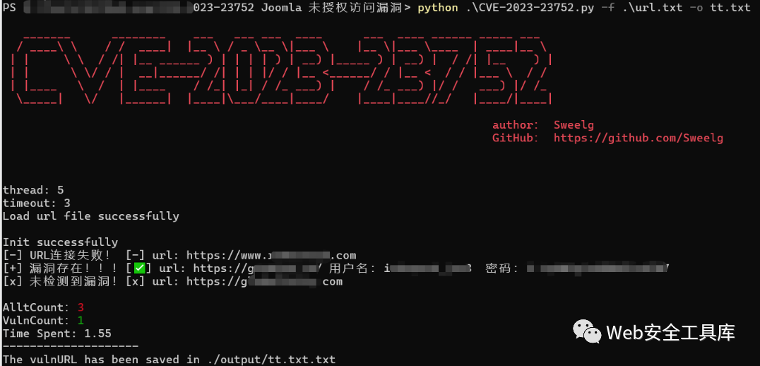 usage: CVE-2023-23752.py [-h] [-u URL] [-f FILE] [-t THREAD] [-T TIMEOUT] [-o OUTPUT]optional arguments:-h, --help show this help message and exit-u URL, --url URL Target url(e.g. url.txt)-f FILE, --file FILE Target file(e.g. url.txt)-t THREAD, --thread THREADNumber of thread (default 5)-T TIMEOUT, --timeout TIMEOUTrequest timeout (default 3)-o OUTPUT, --output OUTPUTVuln url output file (e.g. result.txt)