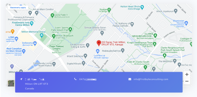 在网上搜索Noray咨询公司时会发现,其主要网站有一个不匹配的域名firstbytecconsulting[.]com。该网站曾是一家专门从事项目管理公司的网站。该域名似乎已于2020年到期,但被购买并重新利用,类似于2020年之前的网站。现在,将这个域名与Noray咨询公司有关的是,网站上的地址详细信息与Noray咨询公司的LinkedIn页面上的地址信息相匹配:这是一家位于安大略省米尔顿的加拿大公司。联系人页面上有一张显示公司位置的地图,但地图是俄语的。这可能意味着制作这张谷歌地图的人的主要语言设置为俄语,这对于一家加拿大公司来说及其怪异。