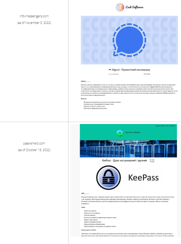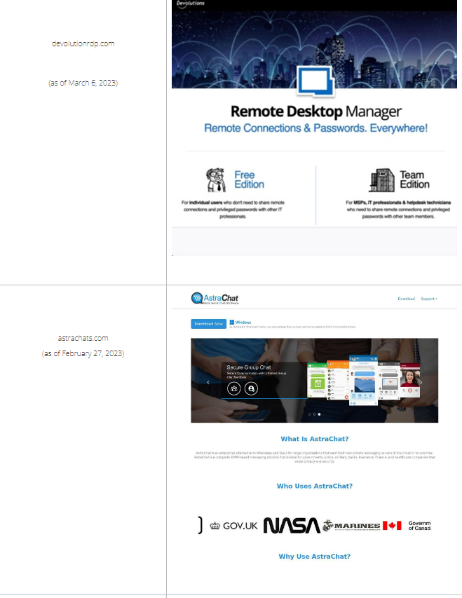 在RomCom诱饵网站上,目标被提供合法应用程序的木马版本,如聊天应用程序(如AstraChat和Signal)、PDF阅读器、远程桌面应用程序、密码管理器和其他通常由系统管理员使用的工具。