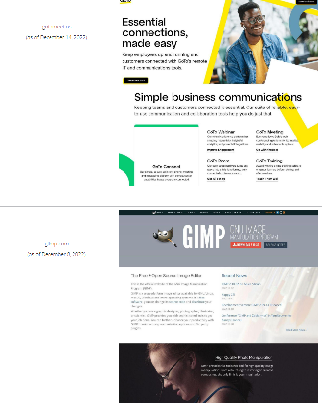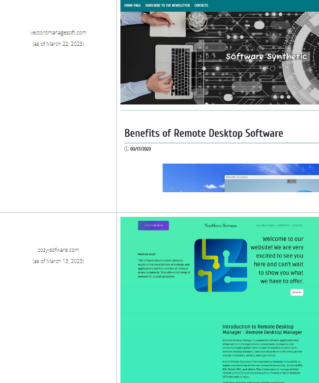 研究人员统计了自2022年7月以来建立的几十个诱饵网站。例如,RomCom在2022年3月对一名欧洲议会议员使用了鱼叉式网络钓鱼,但在2022年10月通过谷歌广告定位了一家欧洲国防公司,该广告导致一个中介登陆网站重定向到RomCom诱饵网站。该中介登陆网站使用了域名“kagomadb[.]com”,该域名后来于2022年12月用于Qakbot和Gozi有效负载。