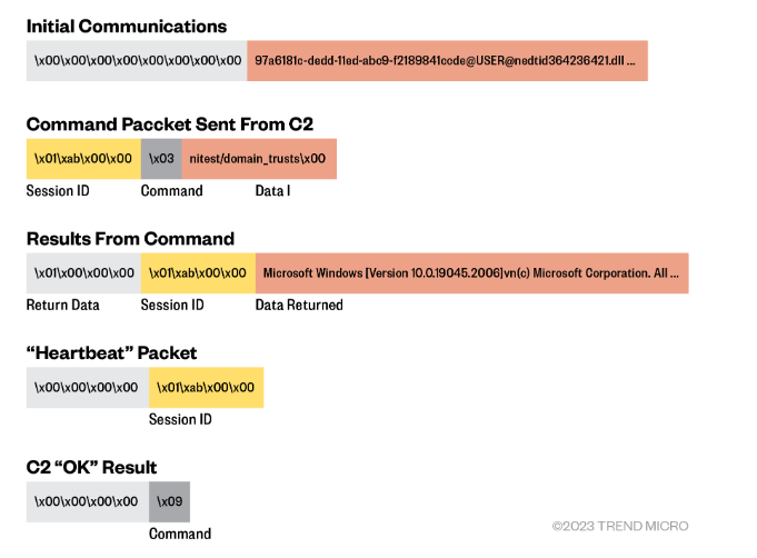 研究人员观察到的第一个命令是命令3,它使用cmd.exe运行带有参数/domain_trusts的Nltest命令。这样做是为了收集受害者计算机可能知道的任何域的信息。一旦命令完成,它将返回会话ID为五字节的命令结果;此时前四个字节是未知的,但研究人员观察到,如果它向服务器返回数据,则第一个字节将为0x01,如果它从服务器接收数据,则为0x00。