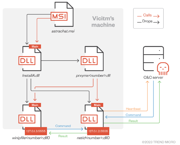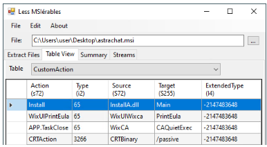 astrachat.msi 文件是一个Microsoft安装程序(msi)文档。尽管安装了与合法的AstraChat软件相关的文件,但它还是打开了一个恶意的InstallA.dll文件,并调用其Main()函数。