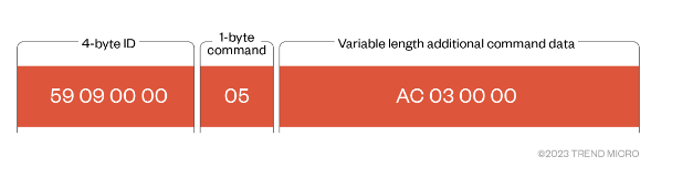 上图显示了接收到命令5的示例,该命令是将文件下载到受害者的计算机上的命令。用于通信的ID是0x950,并且接收到带有附加数据的命令0x05。在这种情况下,附加数据告诉受感染计算机上运行的恶意软件,下载的文件应占用939 (0x3ac – 1) 4KB 块。文件本身是在单独的响应中下载的,因此在这种情况下,受害者端的最终文件大小将为3,846,144字节。作为一种逃避技术,将空字节附加到文件中以实现此结果,附加数据字段的内容可能因命令而异。