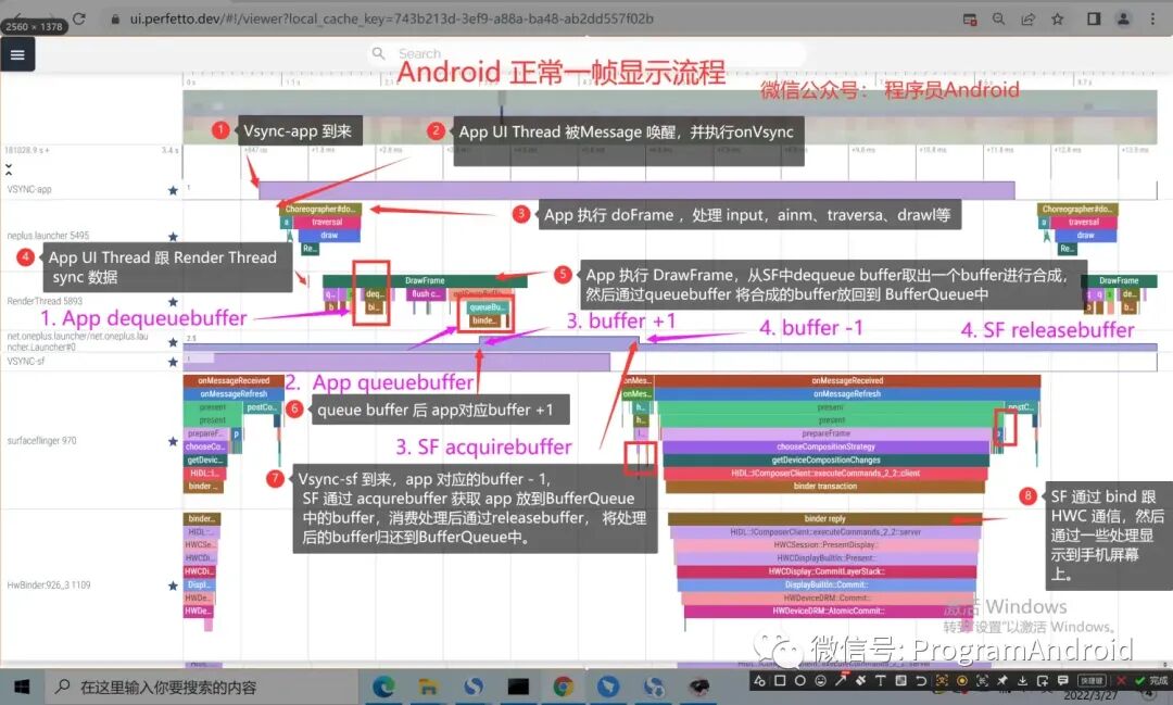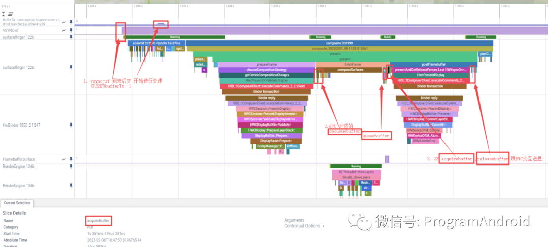swapBuffers,并通知 SurfaceFlinger 图层合成。这里对应的 Systrace 中的渲染线程的 eglSwapBuffersWithDamageKHR 操作