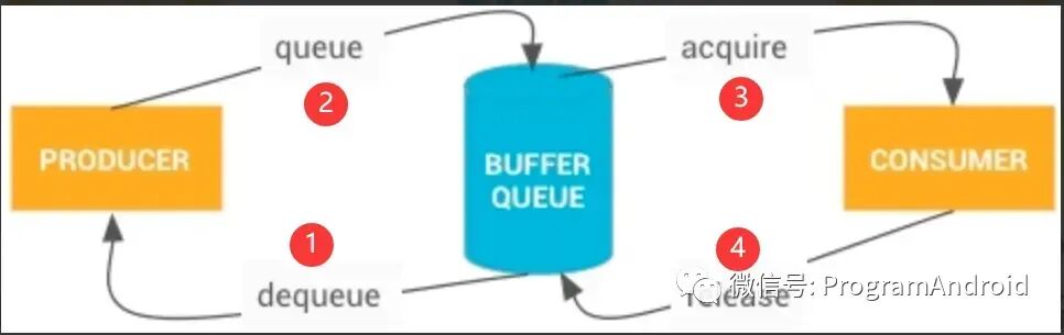 生产者填充缓冲区并通过调用 queueBuffer() 将缓冲区返回到队列。