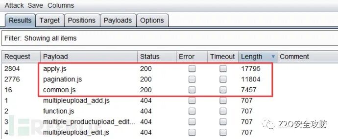 使用Burpsuite的Intruder模块对/js/目录进行JavaScript文件爆破,终于获取到了可用信息!