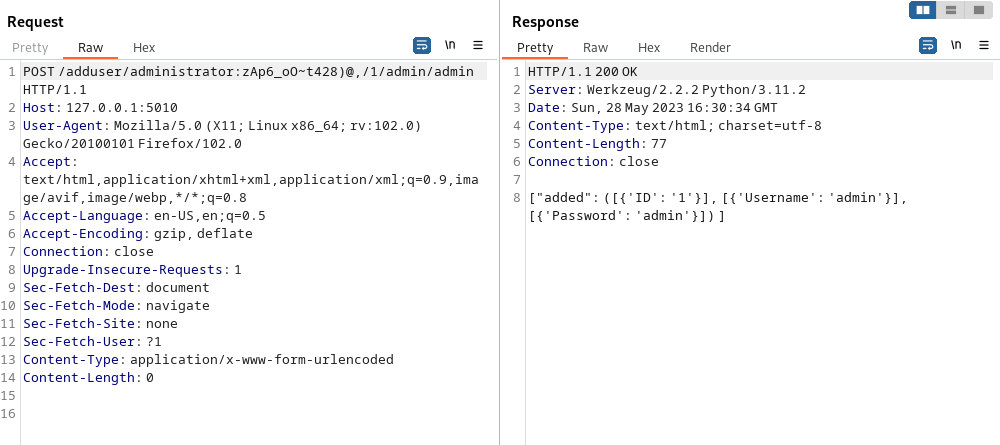 POST /adduser/{admin-username}:{admin-passwd}/{id}/{username}/{passwd}POST /deluser/{admin-username}:{admin-passwd}/{t-username}/{t-userpass}