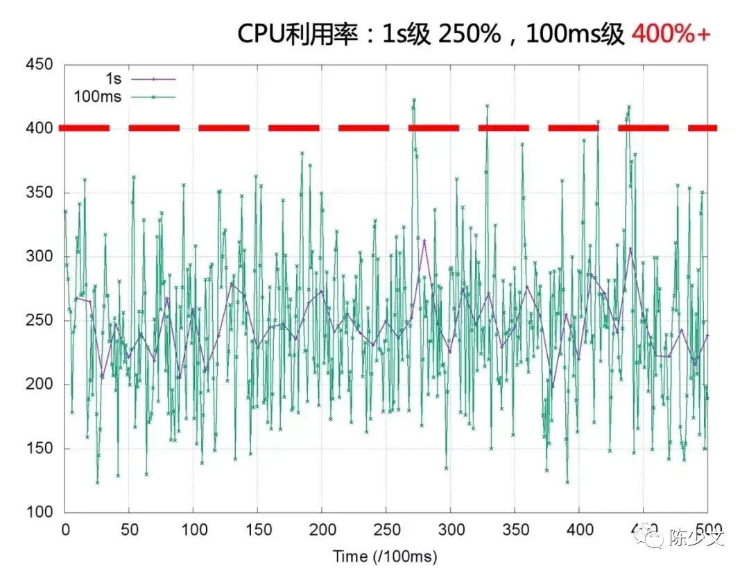 这种情况是因为,Prometheus 的采样频率是 15s,监控粒度太粗,采集不到实时的 CPU 使用情况。而如果采集 1s、100ms 监控数据时,很有可能是这样的。