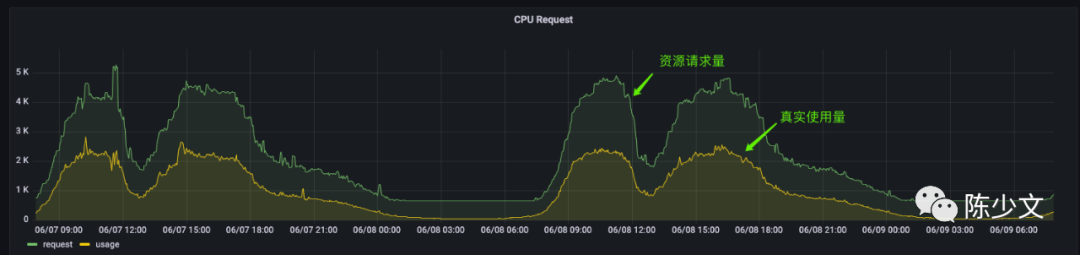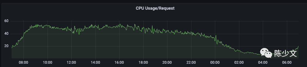资源的请求量会随着使用量波动,而请求量又直接影响到公有云的机器使用数量。如下图是线上 Usage/ Request 的情况,也是我不断优化 HPA 相关参数的指引指标。