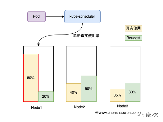因为默认的调度器是静态调度,只看 Request 和 Node 上的 Request 总量,而不考虑实际使量。