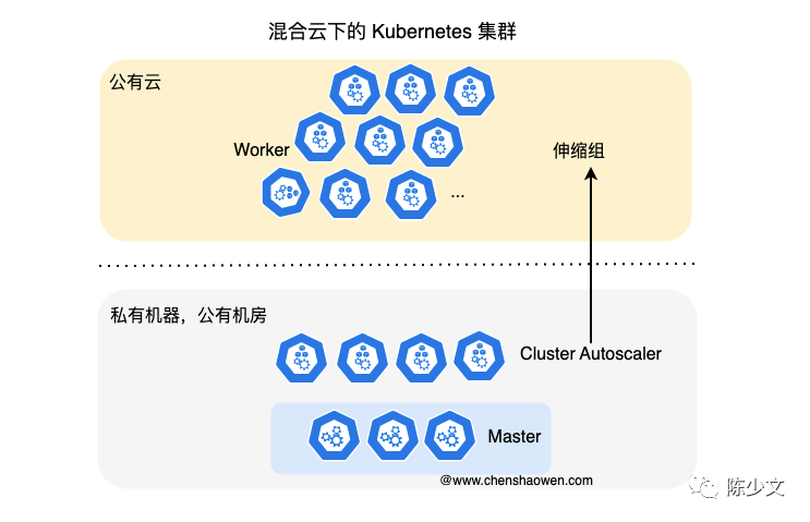 如上图,是一个混合云下的 Kubernetes 集群,私有机房(Master + 部分 Worker)+ 公有云(部分 Worker)。采用 Cluster Autoscaler 组件,对接公有云的弹性伸缩组服务,按需扩容或缩容 Worker 节点。