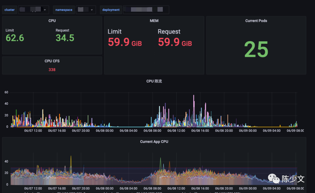 给不同应用设置 Request、Limit、HPA 副本上限、HAP 副本下限、HPA CPU 使用率,是一件繁琐的事情,建议先绘制一个 Grafana 计算面板,可以实时计算调试。类似下图: