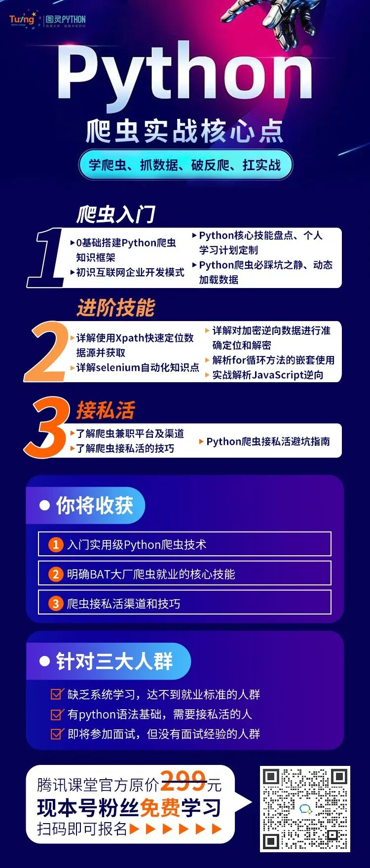 所以对爬虫感兴趣的朋友可以抓住这次机会,迈出学习爬虫的第一步,免费体验2天【Python爬虫实战核心点】,免费课程,名师助力,怎么样都是赚到。
